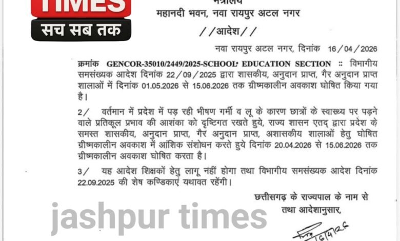मुख्यमंत्री विष्णु देव साय ने जानकारी देते हुए बताया कि अब प्रदेश के सभी स्कूलों में 20 अप्रैल से 15 जून 2026 तक ग्रीष्मकालीन अवकाश घोषित किया गया है।
